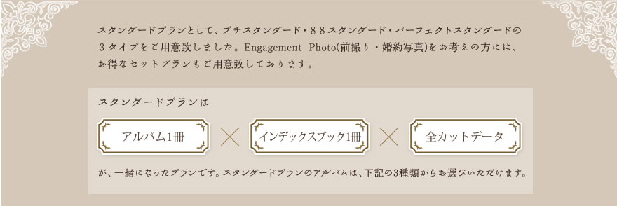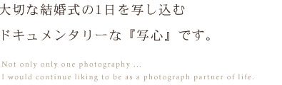 お二人が写真をご覧になられたとき、幸せの時間にタイムスリップされる事を願い、時が経つごとに深みある写真となっていく事を願って、精一杯、心で心を写させて頂きます。 |